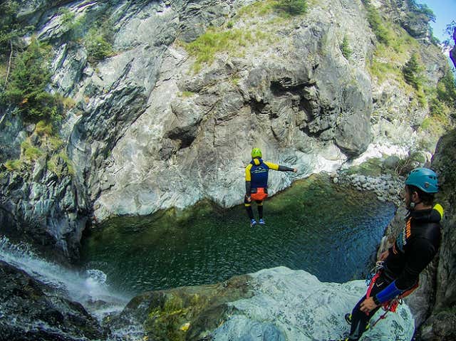 Raggiungeremo il torrente Chalamy con qualche minuto di cammino e...via con l'avventura! Affronteremo un percorso di canyoning adrenalinico, completo e ricco di emozioni, con tuffi da speroni di roccia alti fino a 10 metri e lunghi toboga, gli scivoli naturali scavati dal flusso dell'acqua.