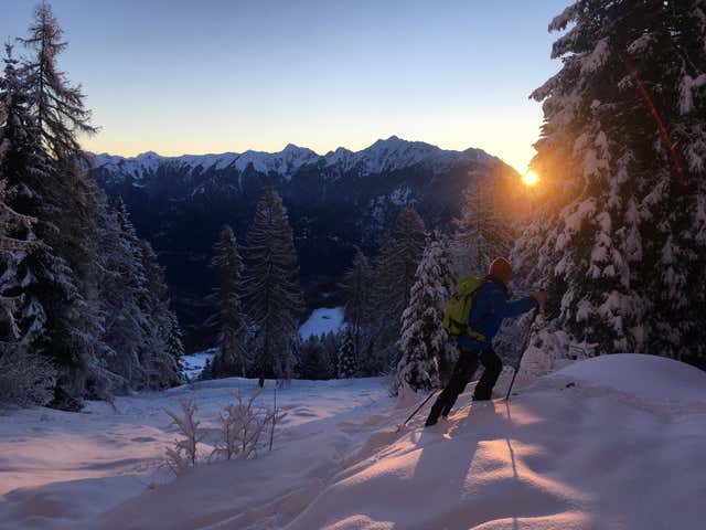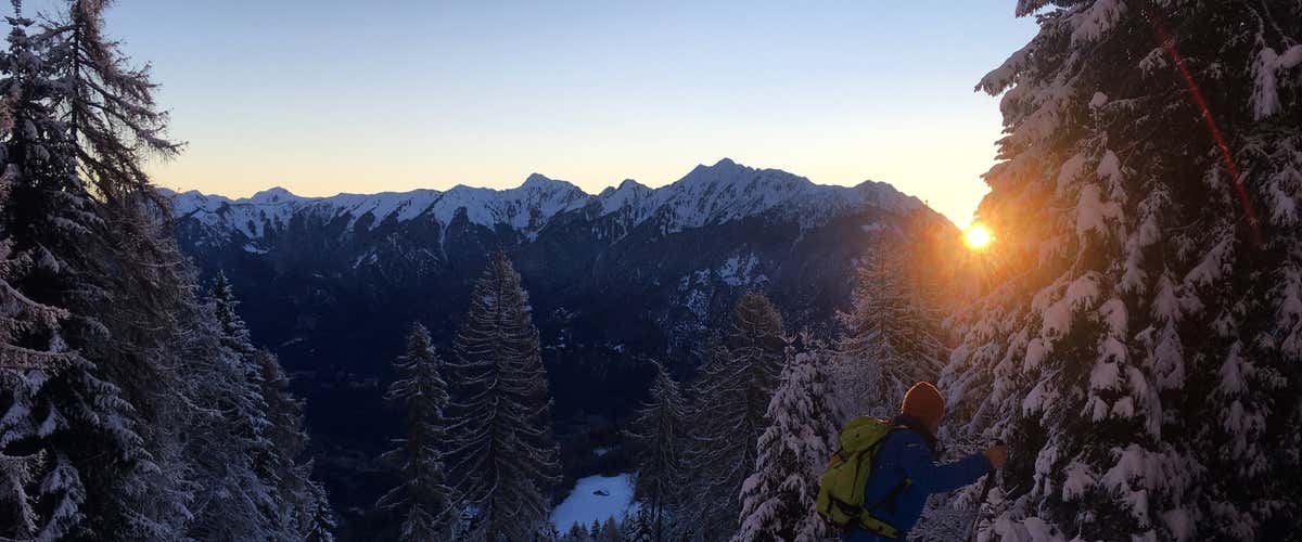 Immergiti nella natura camminando con le ciaspole sulla neve fresca e ammira i colori dei boschi e del manto nevoso quando si tingono delle sfumature del tramonto.