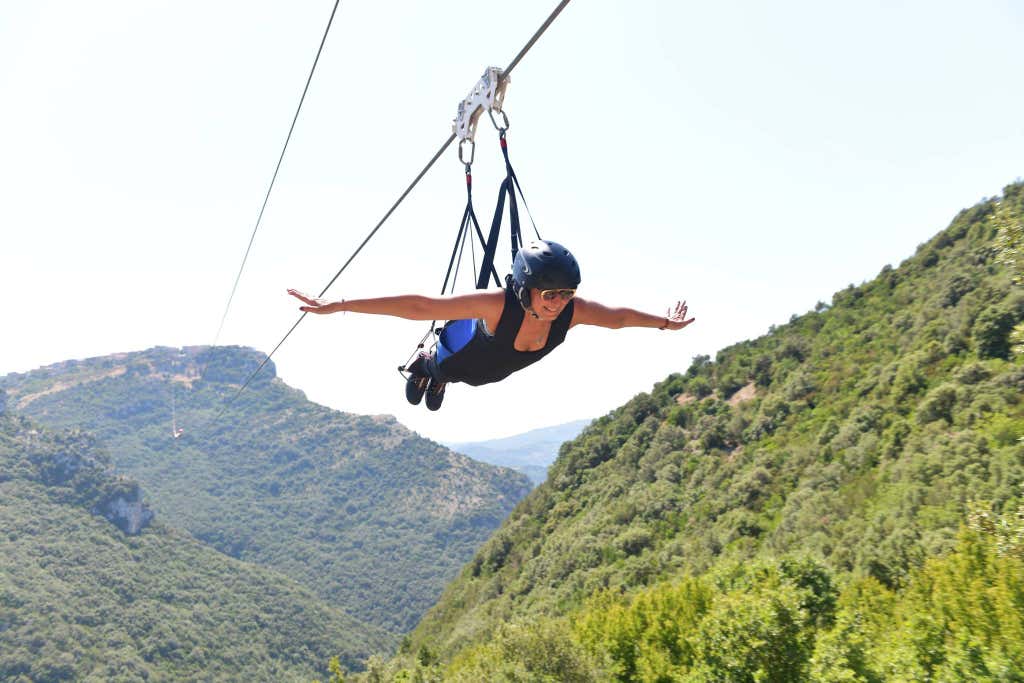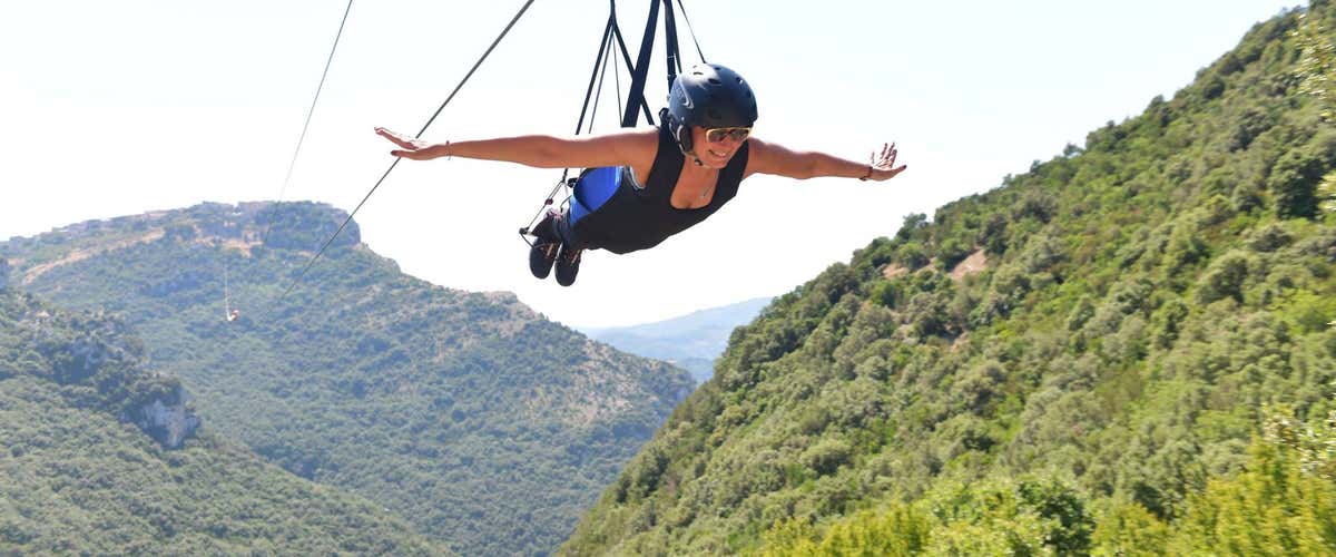 Vola ad ali spiegate, sentendo l'aria sul viso e un brivido che ti attraversa da capo a piedi mentre ti lasci scorrere lungo il cavo d'acciaio lungo 1600 metri che collega le estremità di due alture con vista spettacolare sulla Piana del Sele, sul Golfo di Salerno e sulla Costa Cilentana.